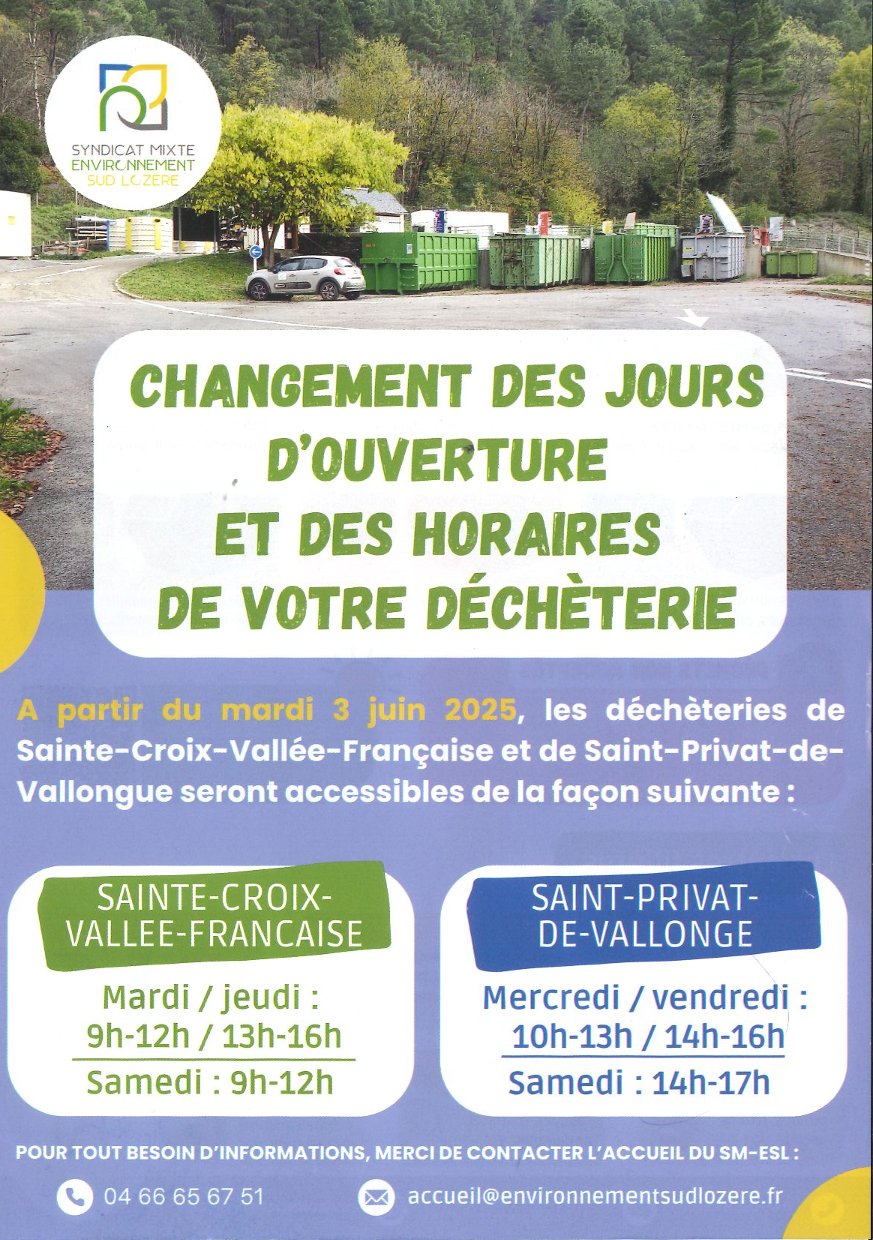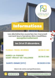 Pendant les fêtes de fin d’année, les horaires de la déchèterie de Saint Privat de Vallongue seront exceptionnellement modifiés les 24 et 31 décembre 2025.