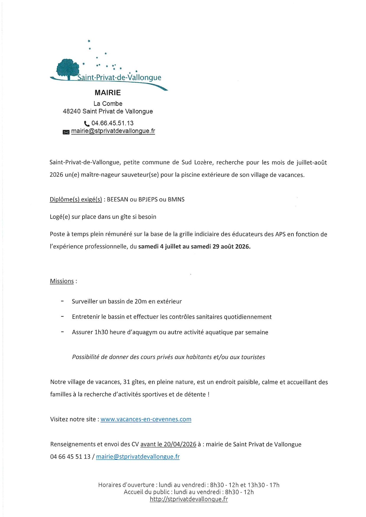 Recrutement Maître Nageur Sauveteur _ Piscine municipale Saison estivale 2026 24 mars 2026 Facebook Twitter Gmail